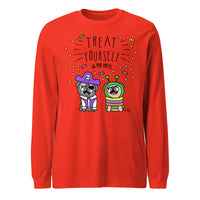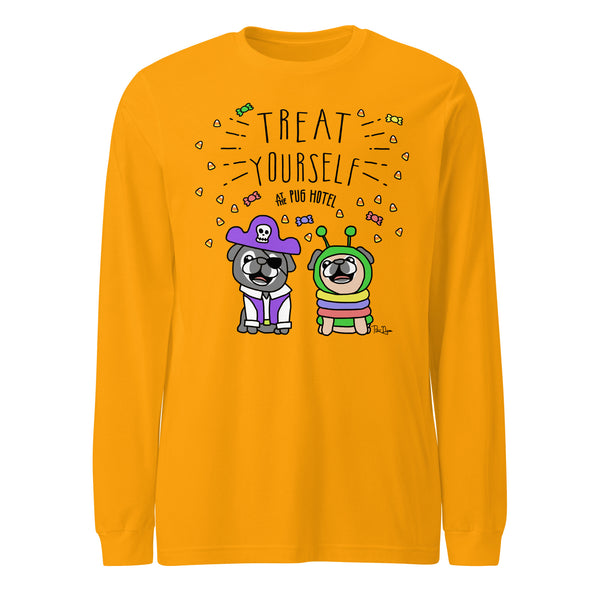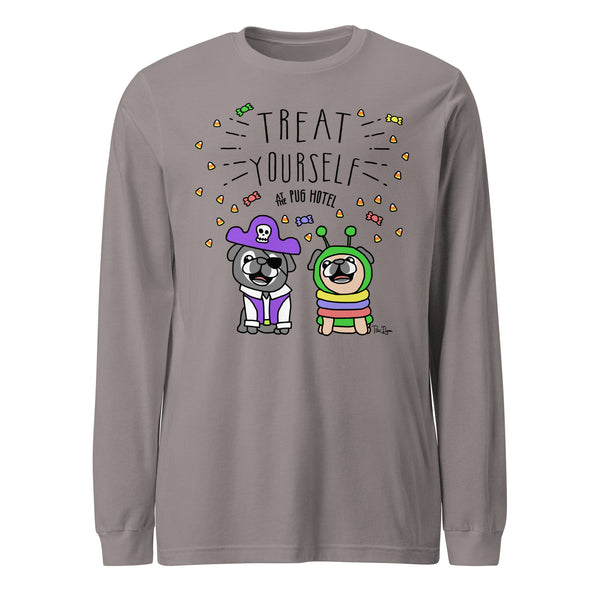 The Pug Hotel Pug-O-Ween long sleeve tee is everything you've dreamed of and more. It feels soft and lightweight. It's comfortable and best of all, 100% of profits go towards The Pug Hotel!